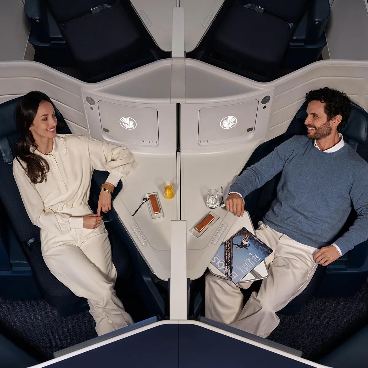 Throughout your journey, enjoy the unique experience of the Business cabin, where every step has been designed with your comfort in mind. As soon as you arrive at the airport, take advantage of priority access with SkyPriority, relax in our exclusive lounges, and, once on board, discover the comfort of an adjustable seat featuring a refined design.